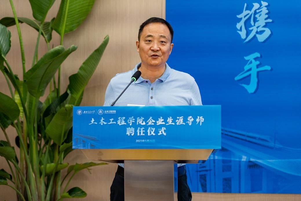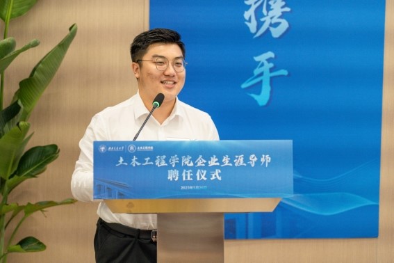 中交四航局第一工程有限公司党委组织部部长、人力资源部经理杜金作为企业生涯导师代表进行了发言。杜金校友首先感谢学校学院对企业生涯导师们的信任和支持,随后向在场师生分享了自己的导师工作经历,建议导师们要以“用心、用情、用力”六字作为今后的工作准则,对待学生要真情实意、要毫无保留,鼓励同学们要满怀信心,勇敢地进行职业生涯探索。