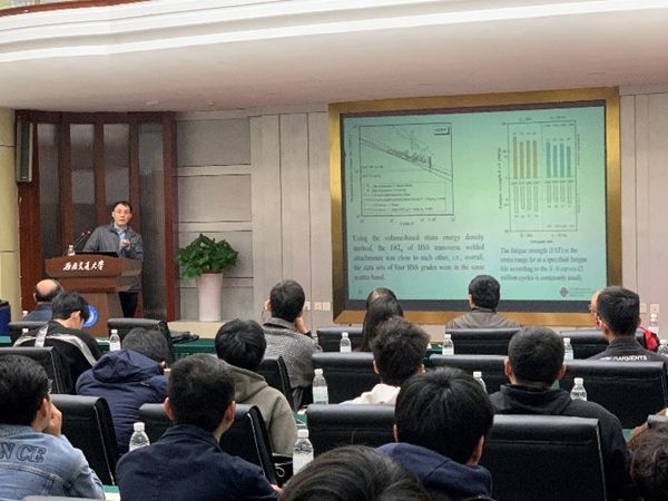 院长蒲黔辉教授、副院长陈嵘教授、祝兵教授、卜一之教授和徐幼麟教授等学院领导和师生代表在现场聆听了报告,大会由陈嵘副院长主持。首先,蒲黔辉院长代表学院对赵晓林教授的到来表示热烈欢迎,并详细介绍了赵晓林教授的科研和工作经历。随后,赵晓林教授就超高强钢的疲劳和FRP加固的研究进展进行了详细的报告。赵晓林教授首先介绍焊接超高强度钢的疲劳,其中包括焊接超高强度钢的关键问题,焊接超高强度钢的疲劳裂纹萌生和扩展以及疲劳评估方法。然后介绍如何使用纤维增强聚合物加固疲劳载荷作用下的钢桥,就其加固机理、加固方式及相关工程应用进行了详细报告。