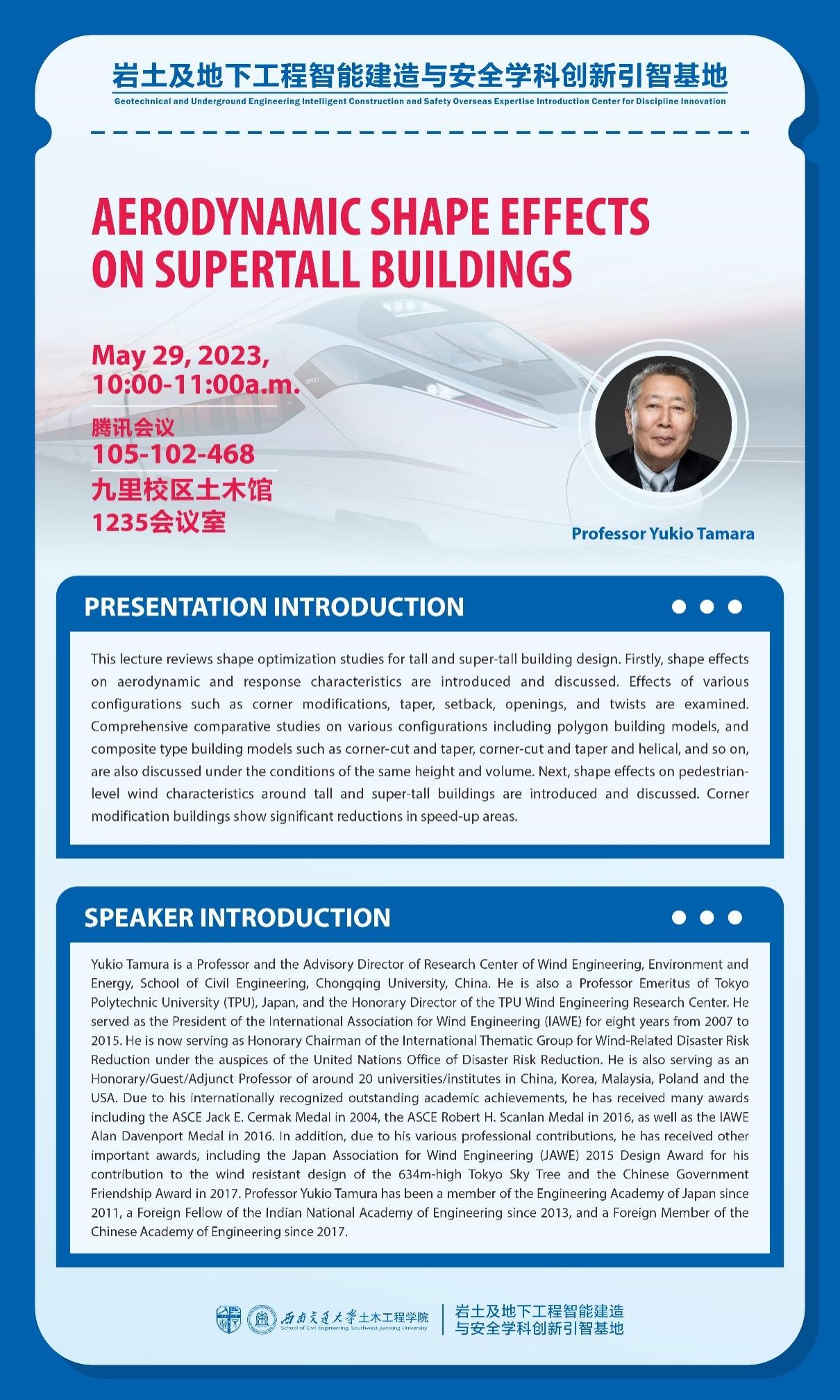 田村教授首先以超高层建筑结构气动外形对其气动特性及动力响应的影响为切入点,讨论了诸如结构切角、开孔、体型收进等不同气动外形优化措施对超高层建筑动力响应的影响。然后,田村教授针对多边形建筑结构和复合型建筑结构的空气动力学特性进行了综合的比较分析;最后,田村教授介绍了超高层建筑气动外形对建筑周边行人风环境的影响。