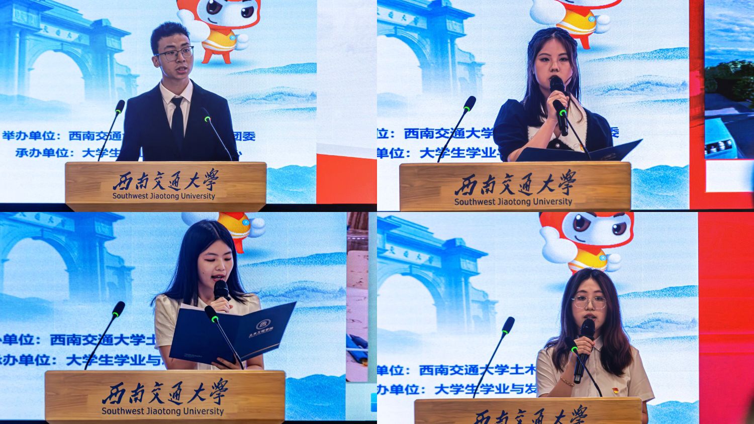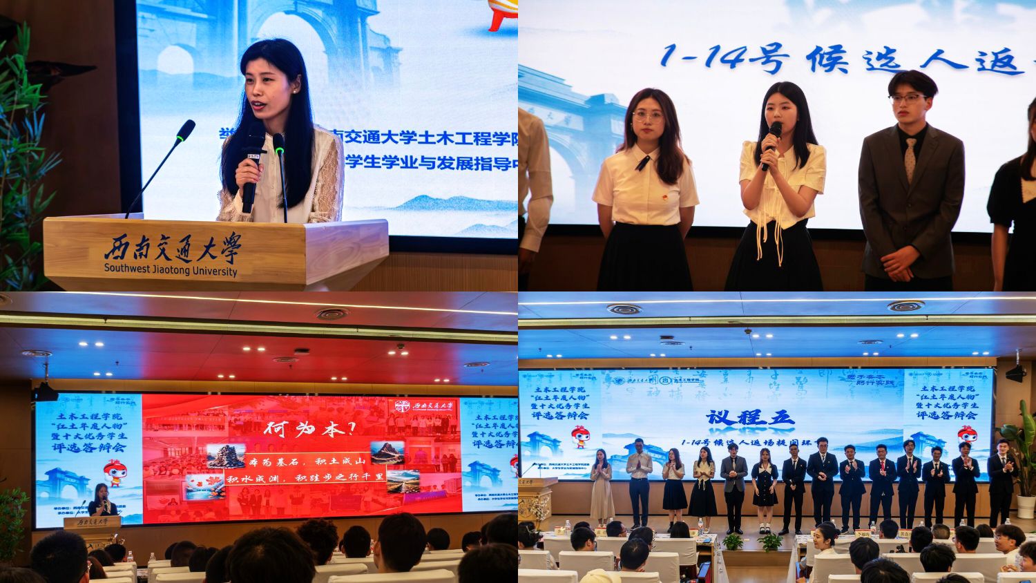 锐意进取勇创新,奋楫笃行深钻研。在答辩展示环节,我们能看到各位候选人积极投身各个领域,贡献土木人的智慧与力量。来自结构2022-02班的齐威铭刻苦学习、积极投身社会实践,结合自己所学的土木专业知识,对留守儿童进行帮扶教育工作和扶贫调研;来自地下2021-02班的宋雨宸先后任职7项学生工作,校级任职3项、院级任职4项,策划协办校院70余场,服务人数累计万余名;来自土木2021-14班的吕一品践行“为人民服务”的宗旨,热爱志愿服务,获评了志愿四川“四星级”青年志愿者的荣誉;来自道桥2021-02班的曹晓华致力于理论分析方法与实际问题的结合,积极参与学科竞赛,先后参与“全国大学生结构设计大赛”、“BIM毕业设计创新大赛”、“大学生工程综合能力创新大赛”等10余项竞赛。