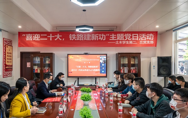 老、中、青三代铁路建设工作者的经历开展。通过学习聆听三位不同时代杰出校友的铁路故事,鼓励全体学生党员与入党积极分子学习忠诚信仰,学习责任担当,学习奋斗动力,以新时代土木青年的姿态面向未来,以实际行动迎接党的二十大胜利召开。