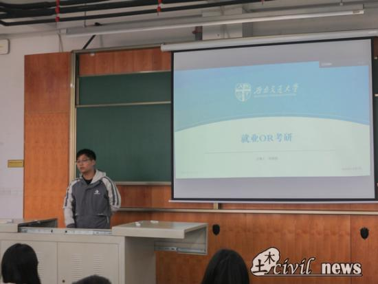 活动伊始,项晨阳同学结合自身考研及工作经历展开分享:考研需要具备良好的心态,注意劳逸结合,在闲暇之余积极锻炼以支持后期高强度的复习;就业相对而言心理压力较小,并且能够获得一定的经济来源。在就业情况瞬息万变的今天,工作对很多同学来说仍是一个未知的领域,因此有一部分同学选择缓就业、慢就业。无论如何选择,项晨阳同学认为选择适合自己的道路才是重中之重。