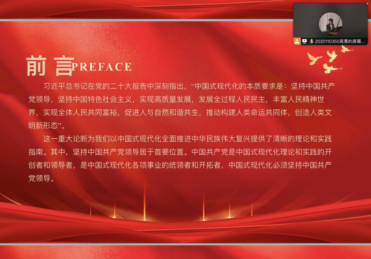 在本次党课上,党支书高熹提到,推进中国式现代化要保持战略清醒,对各种风险挑战做到胸中有数,要做到保持战略自信,增强斗争底气,保持战略主动,增强斗争本领。正确理解和大力推进中国式现代化要全面学习、全面把握,全面落实党的二十大精神,深刻领悟“两个确立”的决定性意义,牢记“国之大者”增强“四个意识”、坚定“四个自信”,做到“两个维护”,努力在新征程上为党和国家事业发展新局面作出贡献。