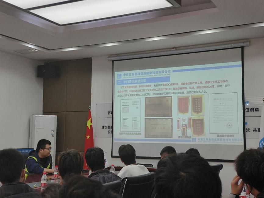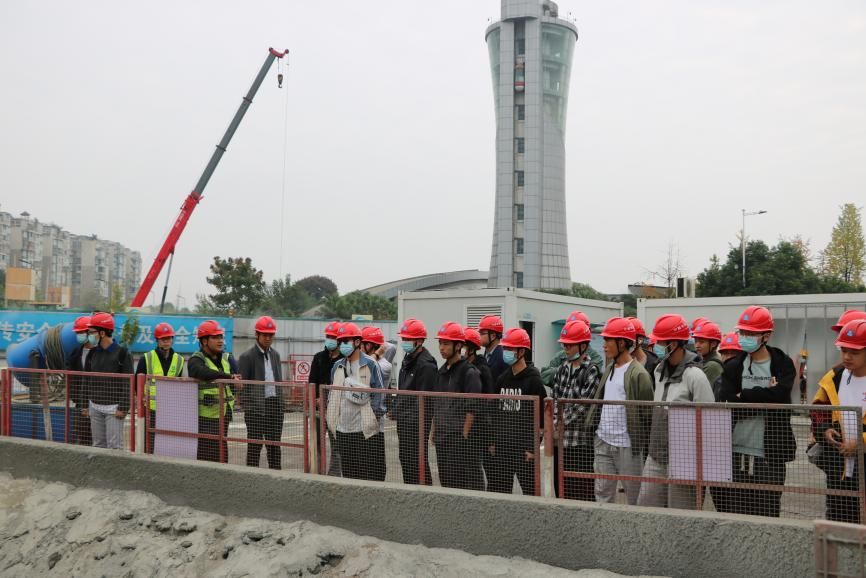 下午14:30,学院师生一行人抵达了成都地铁27号线2工区3分部-韦家碾地铁站C口项目部。首先,中建三局基建投西部分公司人力资源部经理赵坤朋为大家介绍了中建三局以及基建投公司的基本情况,并带领大家观看“三局与城”宣传片;其次,由成都地铁27号线2-3项目技术负责人王大梁为大家介绍成都地铁27号线施工项目情况。然后,项目联合党支部副书记方正带领学院师生参观了27号线2-3工区施工现场,并针对同学们提出的疑惑,进行一一解答。