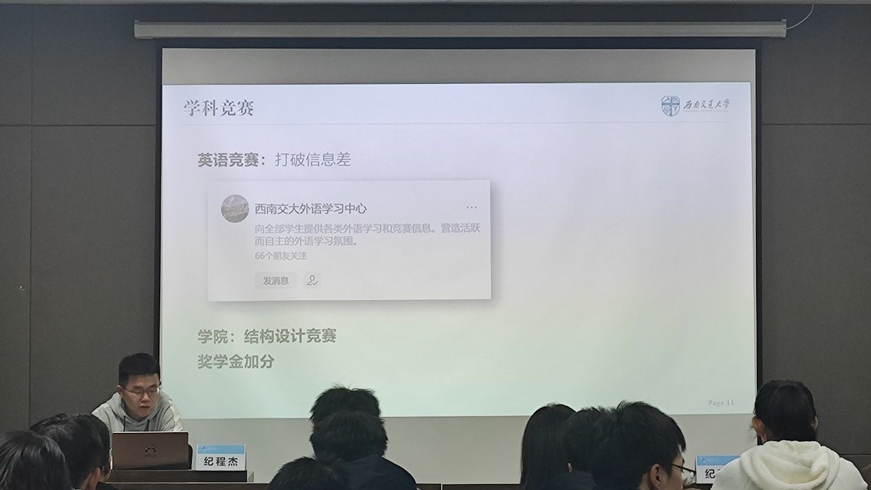 对于学科竞赛,纪师兄鼓励大家多打破信息差积极参与各类学科竞赛,如英语竞赛、结构设计竞赛等。除了能提供奖学金加分外,参与各类学科竞赛还能让我们更加全面发展,为未来的毕业规划方向埋下种子。