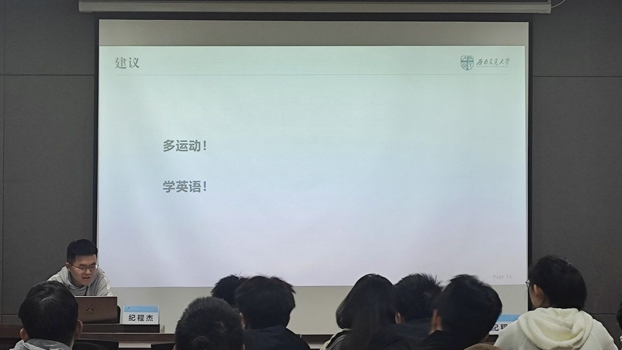 在纪师兄看来,毕业规划主要分为读博和工作两个大方向,而无论哪种选择都应该早做准备。纪师兄还强调当下我们不必焦虑,因为我们还有较为充足的时间进行准备。多参与实习、论文撰写进行准备,考虑哪条路更适合自己,但最迟也应当在研二暑假前做出决定。最后纪师兄还给予同学们两个建议:多运动、学英语(六级尤为重要)。前者保障我们研究生生活的身心健康,后者则能为我们未来出国留学、参与外企工作等有较大帮助。