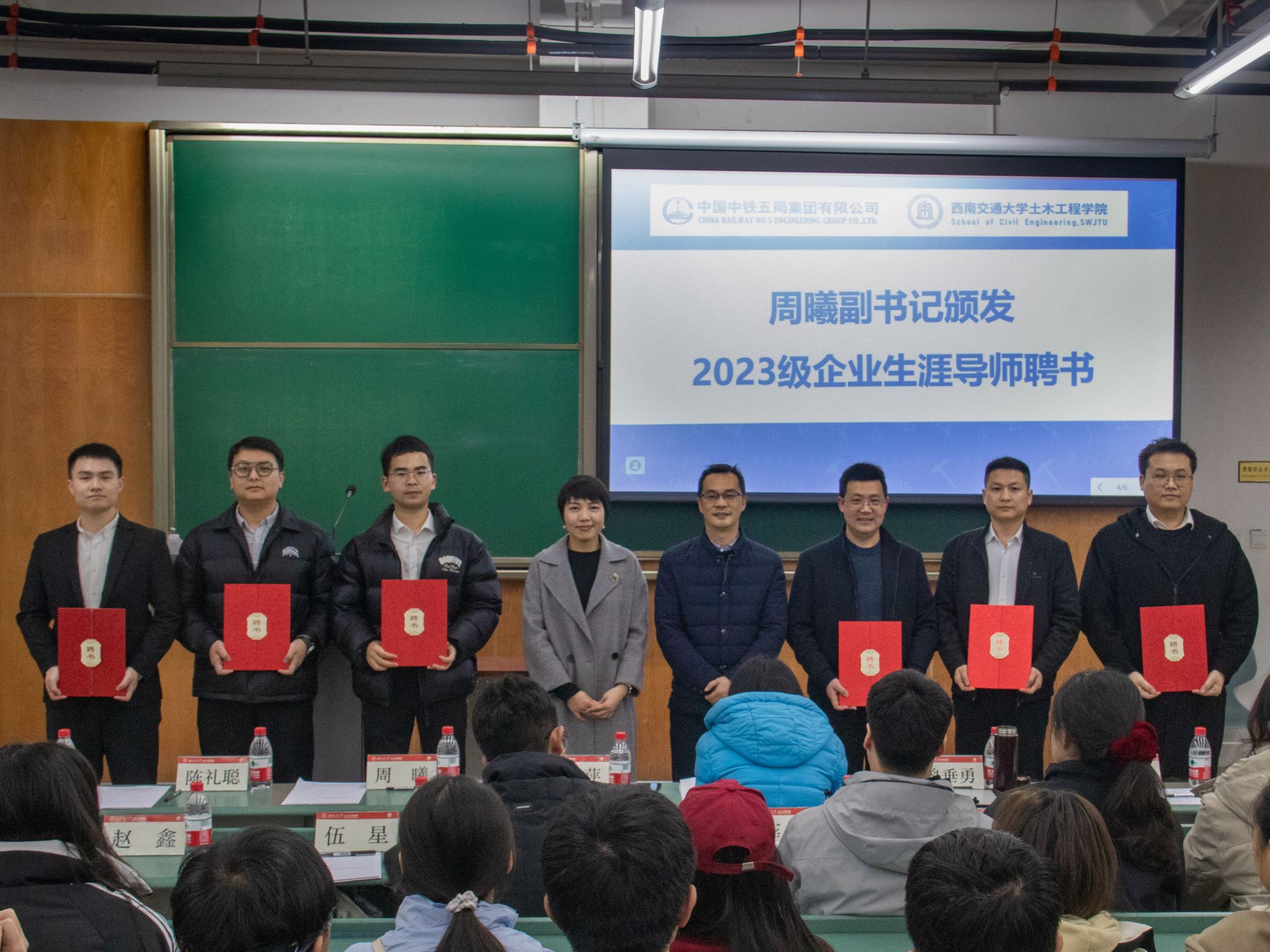 会议第二项,由周曦副书记向中铁五局2023级企业生涯导师颁发聘书,并进行拍照留影。周曦副书记再次向中铁五局对学院的关心与支持表达由衷的感谢,同时也希望继续与中铁五局积极合作,共同培养国家栋梁之才。