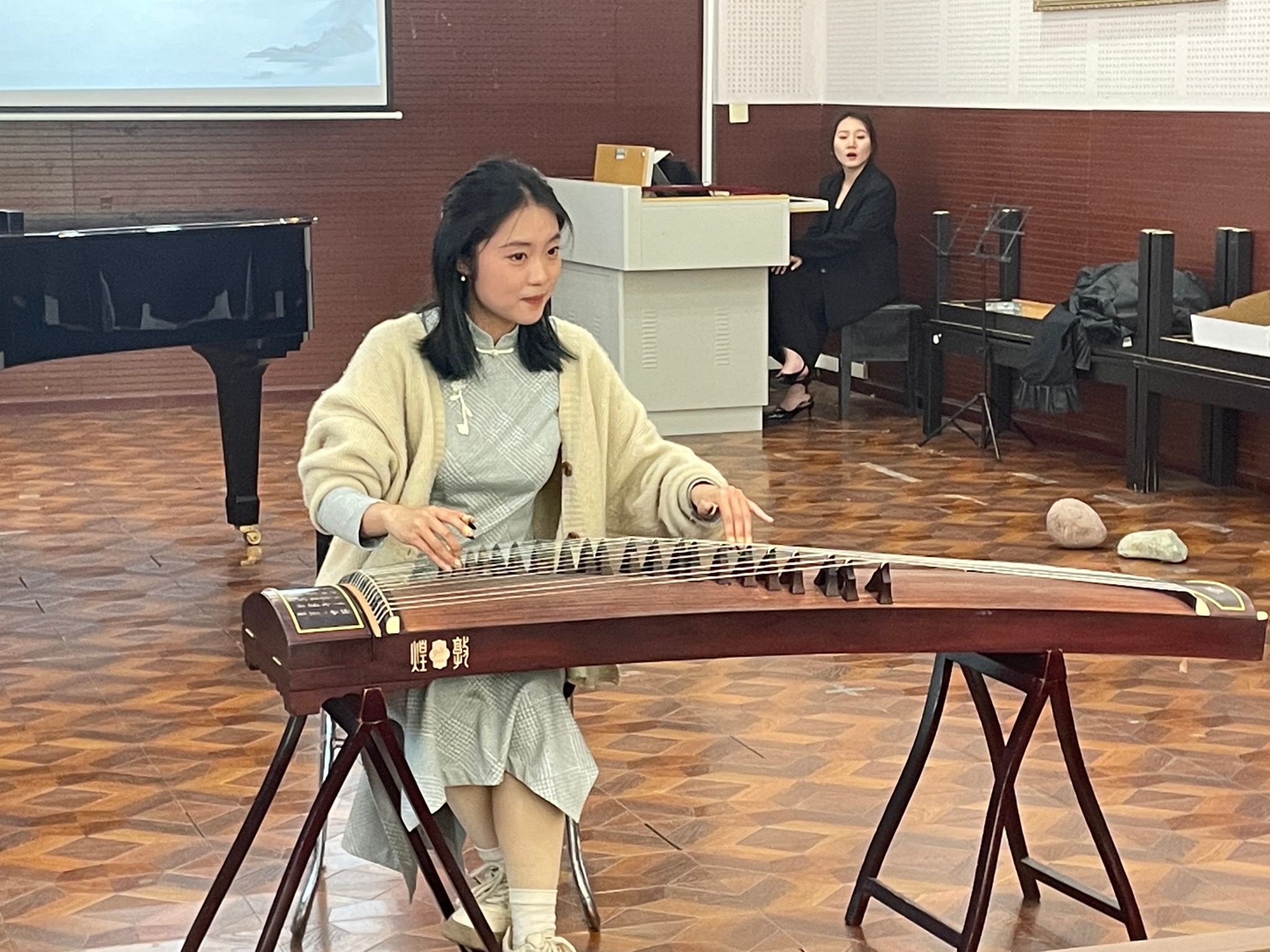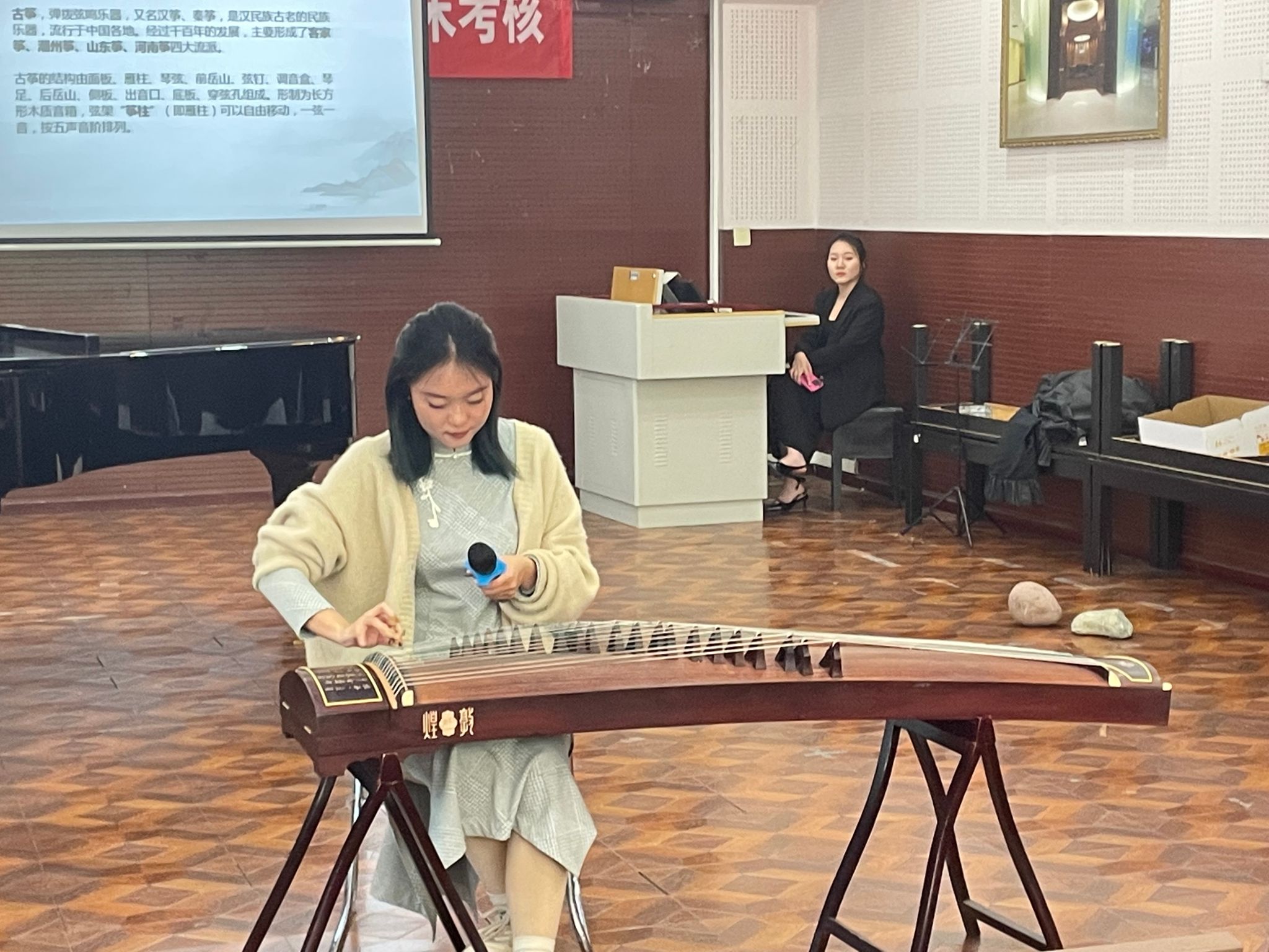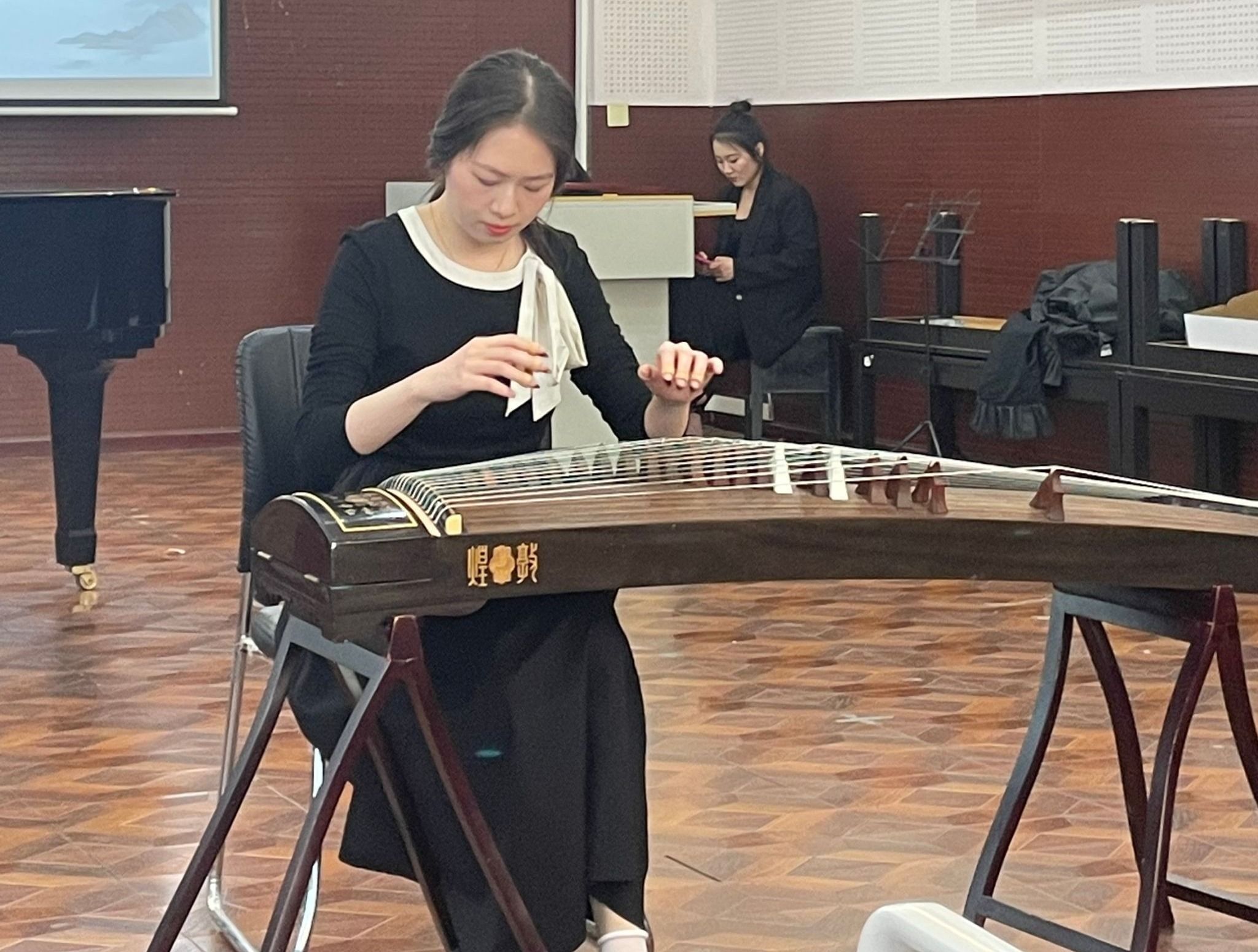 在中华文化的历史长河中,传统乐器一直扮演着不可或缺的角色,古筝、琵琶、阮等传统民乐乐器,不仅代表了中华音乐文化的精髓,也体现了古人对于音乐的深刻理解和无限创意。活动伊始,人文学院的郭佳同学向“红志班”学员们介绍了古筝的起源与发展。早在公元前5世纪至公元前3世纪的战国时代,古筝在秦国一带广泛流传,故得名秦筝,距今已有2500余年的历史;此后,又逐渐流传到了河南、山东、广东、浙江、内蒙古等地。由于历史的变迁和地域的影响而造成了地方风格、演奏技法等的不同,并因此形成了当今各种不同的古筝流派,使古筝的发展日趋繁荣。在介绍完古筝的起源后,郭佳同学首先为学员们带来演奏曲目《婵歌》,《婵歌》以古代才女貂蝉为主题,演奏者用音符塑造出貂蝉曼妙的舞姿。随后,邢芳菲同学带来演奏曲目《海之波澜》,《海之波澜》则描绘出海鸥飞翔、惊涛拍岸的情景。古筝演奏者们在黄维同学的钢琴伴奏下,以精湛的技艺将古筝的每一个音符都演绎得淋漓尽致,学员们仿佛穿越千年,置身于古代宫廷的雅乐之中。古筝作为中国传统乐器的代表之一,以其独特的音色和演奏技巧,展现了中国民乐的深厚底蕴。