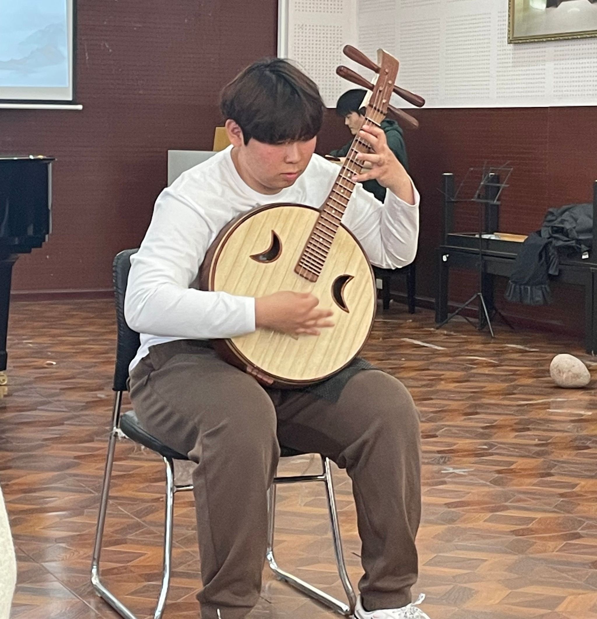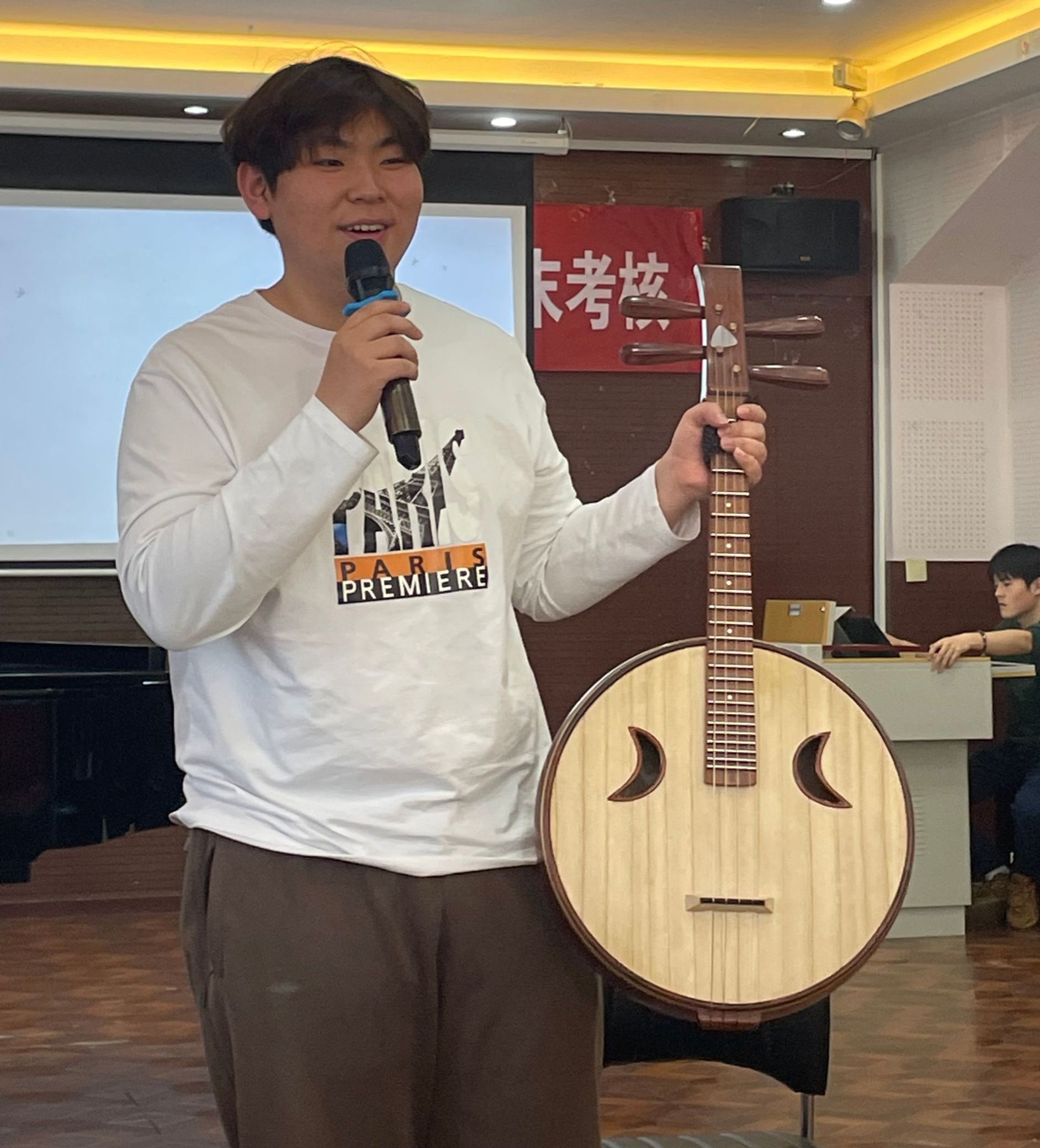 随后,赵启轩同学为学员们介绍了阮的起源,并带来中阮独奏《满江红》。通过其细腻的指法,将阮的独有音色展现得淋漓尽致,令学员们真切感受到民族英雄岳飞的“怒发冲冠凭栏处,潇潇雨歇,抬望眼仰天长啸,壮怀激烈”。