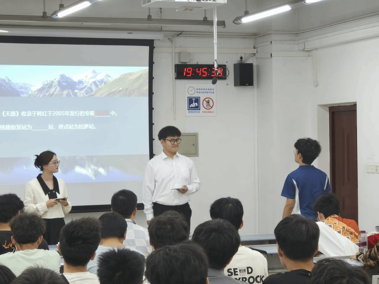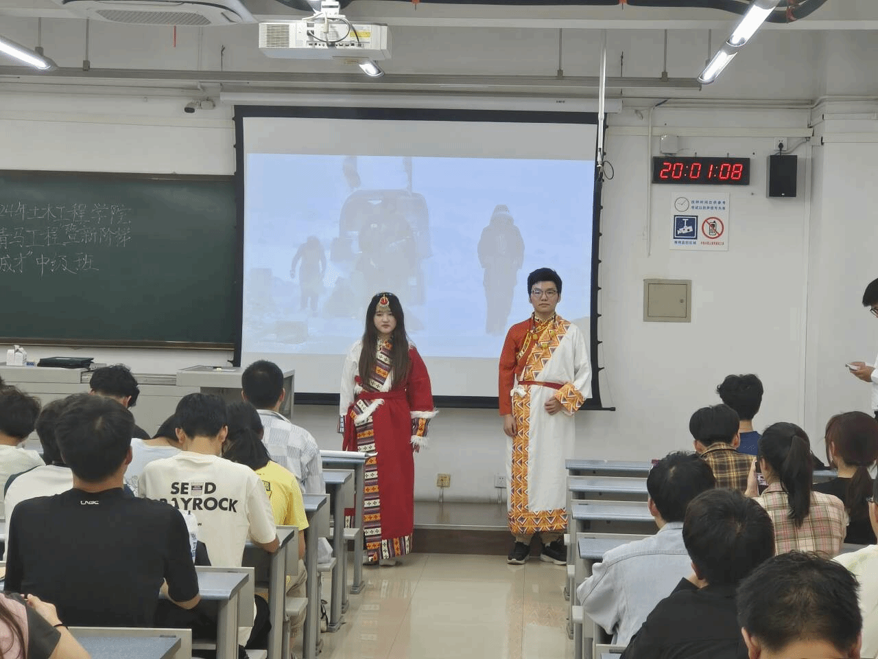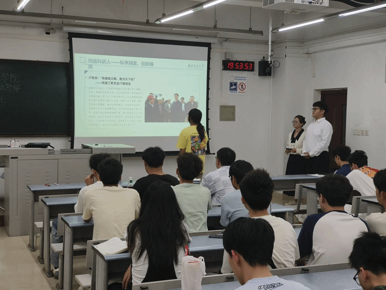 课程主要由四个环节组成,分别是:青藏铁路的情况介绍、大学生艺术团成员领唱并合唱歌曲《天路》、科研前辈的探索路程分享、观看视频。首先,通过观看青藏铁路介绍视频,同学们对青藏铁路有了基本的认识,然后主持人以提问同学们有关青藏铁路相关知识的方式开启了今天的讲演分享。接着,主持人邀请了同学们上台朗读四位科研前辈的故事,让同学们更深刻的了解了有关青藏铁路建造的困难艰险以及前辈们为了建造青藏铁路做出的杰出贡献,学习到了铁路工作者身上的高贵品格与踏实刻苦的精神。