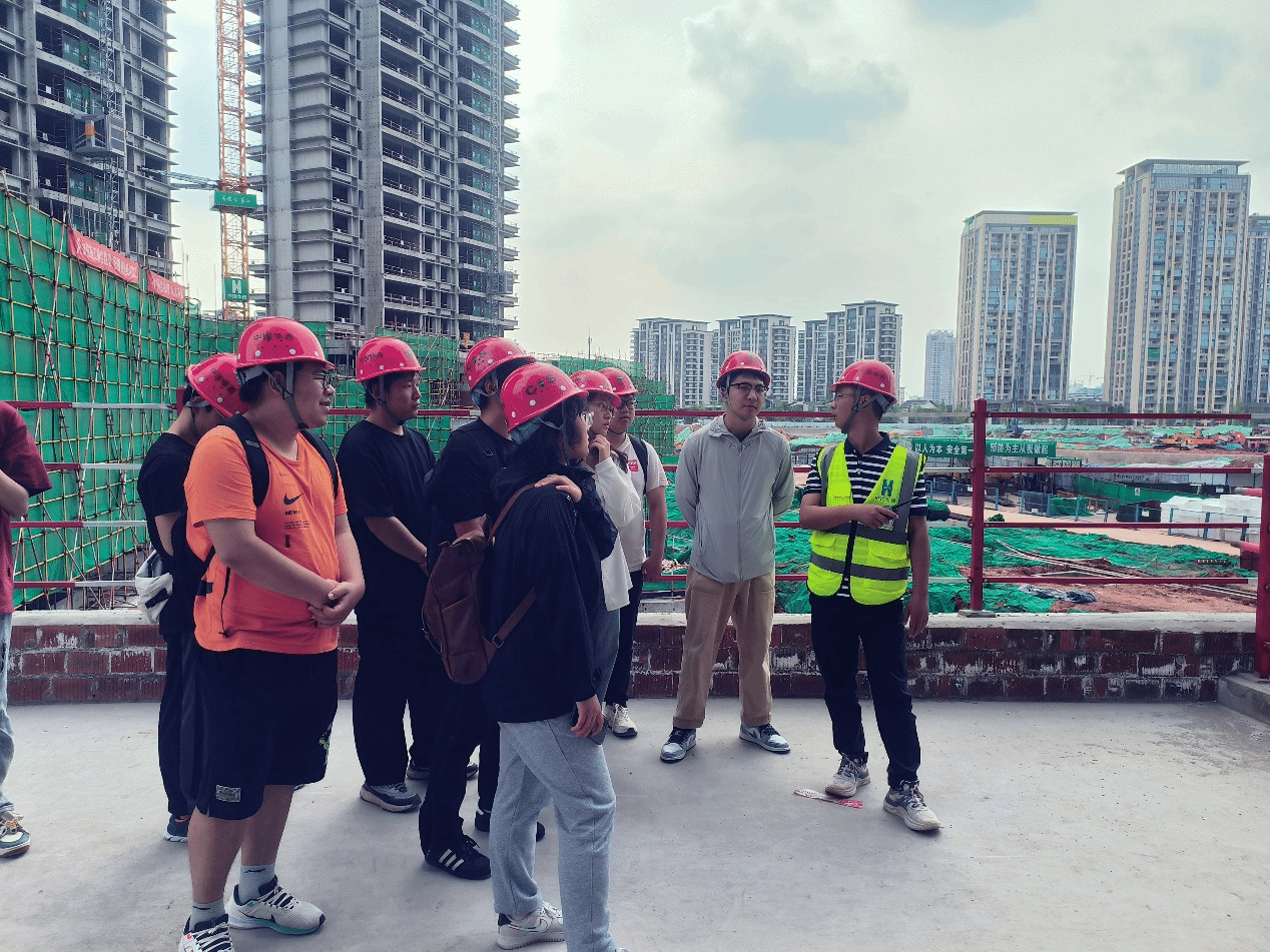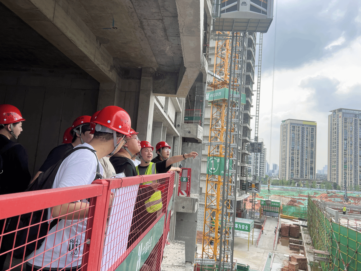 团建中心指导老师贾文怡、红志班及中级班成员一同前往华西四川机司的麓湖生态城C7项目部进行实地参观学习。抵达目的地后,学院师生在工作人员的安排下,佩戴好安全帽,做好防护措施,前往施工现场观摩。