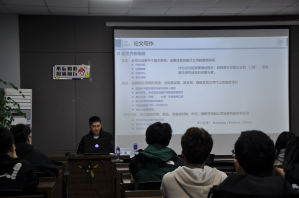 论文写作是科研成果的核心体现,一篇好论文具备内容充实、绘图精美、论据充分和层次清晰的特点。王师兄分别在正文写作、成果讨论、参考文献和科研工具这四个方面,为大家详细剖析了可能会遇到的问题,同时提供了许多的写作方法与技巧,让研究生们对如何撰写一篇高质量的学术论文有了更深入的认识。