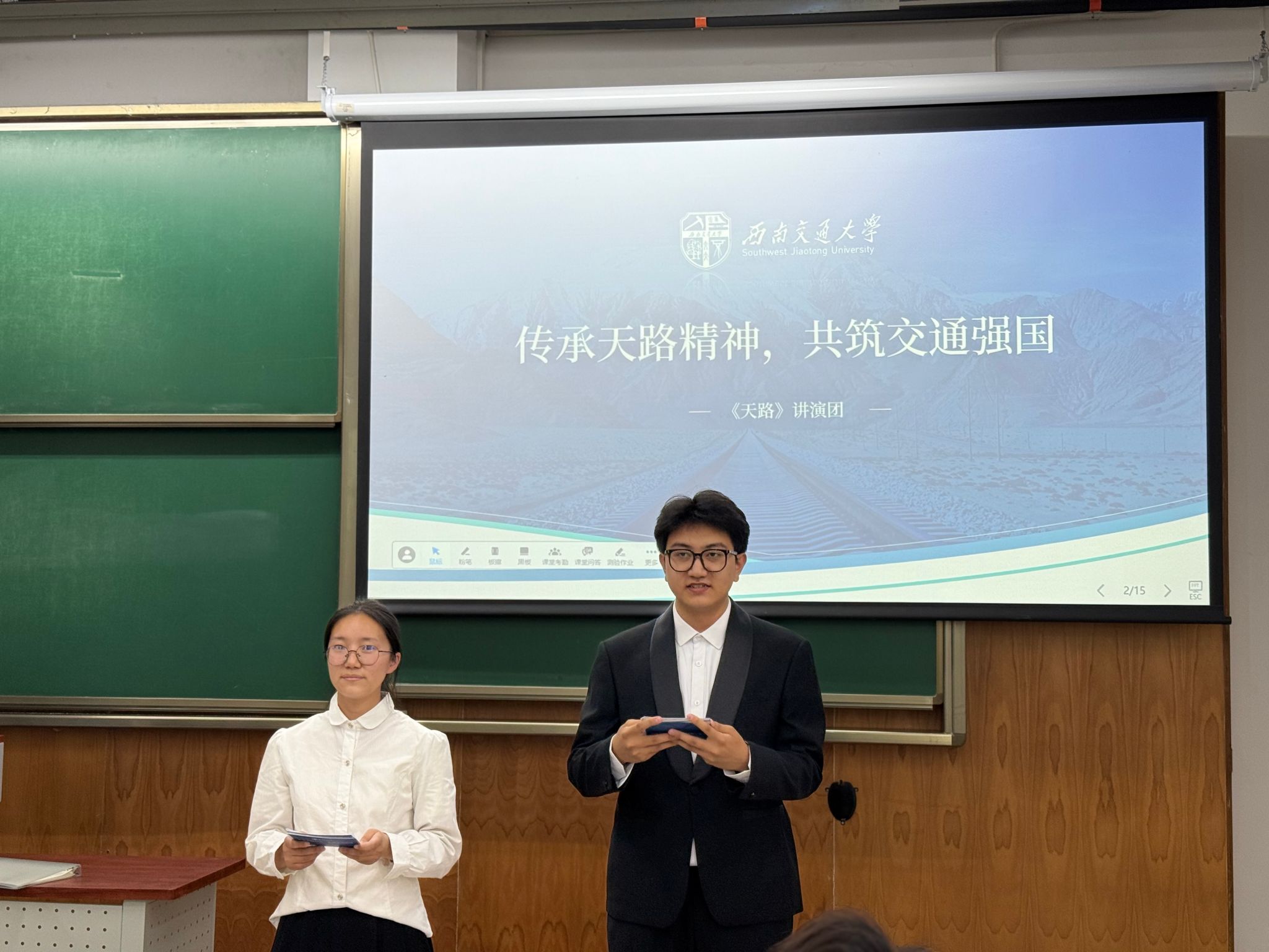 “青马工程”暨“新阶梯成才”学生干部培训中级班聚焦部长级学生干部群体,精心策划系列活动。5月15日下午16点,随着主持人陈雨婷、王志涛热情洋溢的开场致辞,由“天路”讲演团为我们带来的“传承天路精神,共筑交通强国”专题讲演活动在犀浦校区X4157教室拉开帷幕。专题讲演活动旨在通过艺术与精神的交融碰撞,为学院学生干部带来一场别开生面的思想启迪之旅。