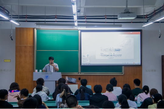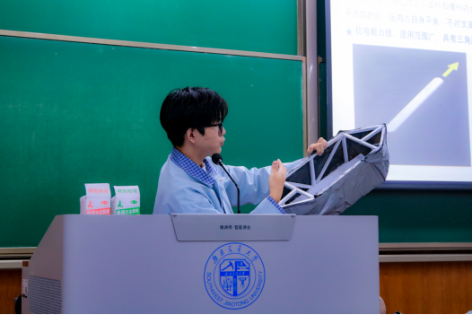 在主持人介绍了赛题基本情况后,答疑会正式开始。首先进行的是第一环节。在张森同学的讲解和PPT中,各参赛选手了解到命题背景为船只结构的创新设计,且利用标准白卡纸进行模型制作。现场通过实物展示的方式对范例模型进行了说明,着重展示其结构构型和基本外观。通过科创中心结构组长吕忠同学的深度演示,本次竞赛目的旨在让2025级土木新生能够结合土木工程专业特色,培养其创新思维和动手能力。并依次介绍了参赛作品的给定的原材料、作品要求、理论方案和模型收取等参赛选手特别关心的问题。