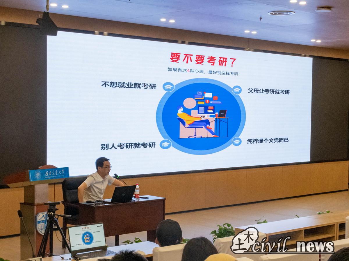 党委副书记周曦详细阐述了应届生毕业将面临哪些具体选择,介绍了就业、保研、考研等方面的详细调研数据。他指出,不论学生选择就业创业还是选择升学深造,学校和学院始终会为学生提供支撑、保驾护航。同时他指出,学生做出未来人生规划的选择之后就要坚定不移地为之努力。此外,周曦副书记还介绍了考研方面相关注意事项。