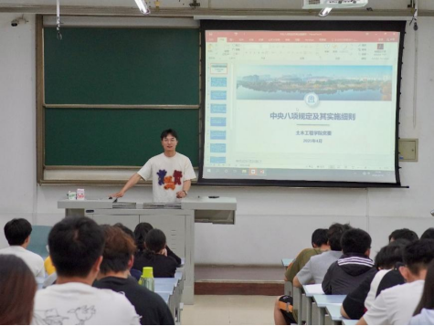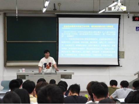 王森老师首先对中央八项规定和中央八项规定精神进行了介绍和阐释。中央八项规定其内容包括:改进调查研究、精简会议活动、精简文件简报、规范出访活动、改进警卫工作、改进新闻报道、严格文稿发表、厉行勤俭节约等8个方面;中央八项规定精神实质在于倡导厉行勤俭节约、反对奢侈浪费和奢靡之风、提倡廉洁从政以及坚持务实的工作作风等。与这些相违背的行为,即被视为违反了中央八项规定精神。随后,各位积极分子对关于“如何落实中央八项规定精神”的研讨进行发言,王森老师进行总结,以简单直观的方式让在场所有的入党积极分子学习领会中央八项规定精神实质。
