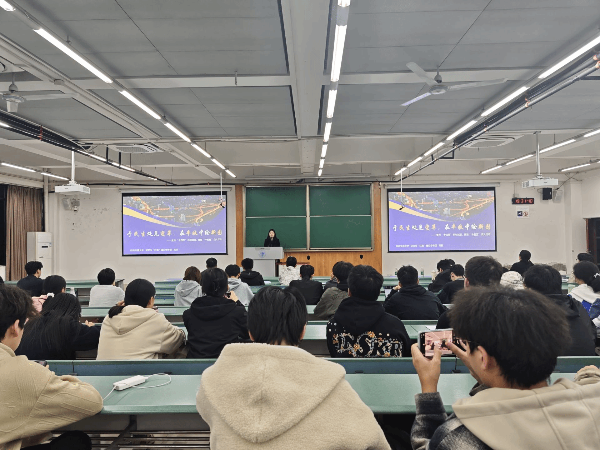 主题分享伊始,在互动环节里,同学们结合自身的体验分享感受。同学们提出,科技离日常生活很近,在互联网和物流高速发展的当下,线上购物非常便捷,几乎触手可及。也有同学将关注点放在城市交通上,指出成都地铁线路的延伸以及智能服务,极大地提高了跨区域出行的效率,这正是“十四五”交通科技成果在城市生活中的直接呈现。
