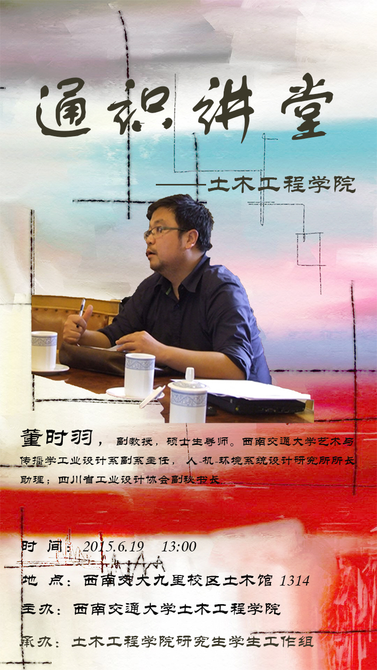 广泛的了解不同学科的知识及文化背景有助于开阔视野发掘学术兴趣和增强学术功底,广泛涉猎各个学科领域这对优化学生的知识结构提升学生的综合素质具有不可替代的作用。为丰富研究生的课余生活,提升学院研究生文学、艺术、美学等人文素养,加强土木学院研究生通识教育,学院继续开展研究生“通识讲堂”系列活动。为此,学院邀请艺术与传播学院工业设计系董时羽教授做客第二期“通识讲堂”,并为广大研究生同学带来“设计心理学”专题讲座。我们期待您的参与,一起领略别样风采,青春研途。