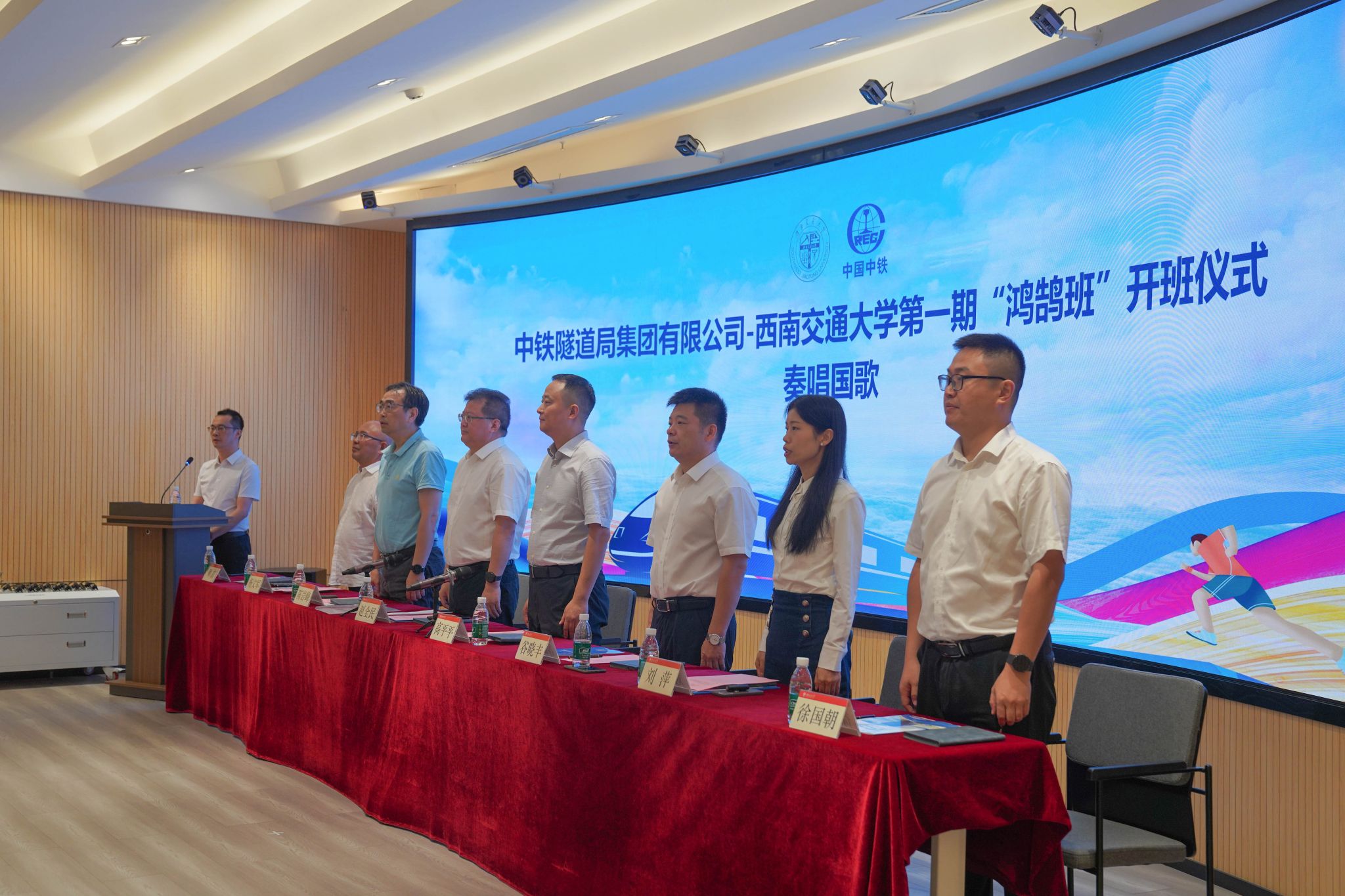 会议伊始,周曦副处长向校企双方介绍了本次参会领导及嘉宾,随后,全体成员起立,奏唱国歌。