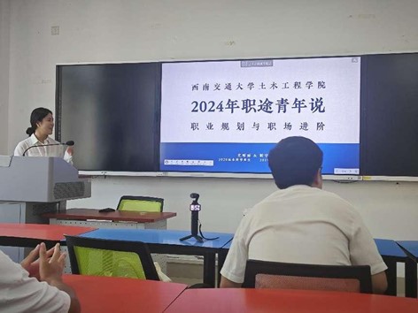 2024年9月13日下午3:30,“职途青年说”第一期如期举行。此次活动邀请了两位来自中铁五局的优秀青年代表——靳宇轩和史昕雨,他们结合自身经验,就职业发展、学习考试、职场规划等内容进行了深入分享,吸引了众多学生的关注与参与。