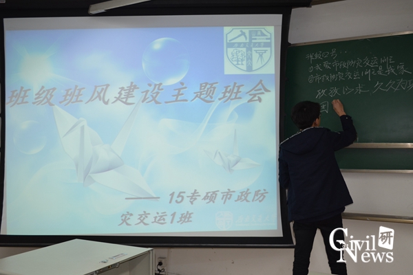 2015级专硕市政防灾交运1班在逸夫馆4304A室举行了“班风建设”主题班会,班会由班长史晓主持,该班全体学生参加了此次会议。
