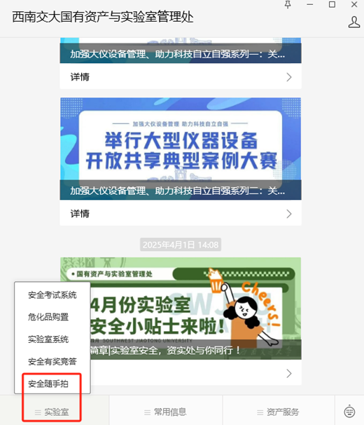 报送方式:扫描二维码,关注“国有资产与实验室管理处“微信公众号,选择“实验室”—“安全随手拍”(如下图所示),填写隐患所在的校区、位置、隐患描述等内容。