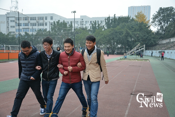 第三项活动是绑腿跑,这个对团队协作能力的要求还是相当高的,四个人一起,步调稍不一致就可能摔倒。大家发挥专业优势,做起了试验,把各种想出的对策都试验了一遍,最终一致认为喊口号是最有效的方法,绑腿不能绑太松也很重要。比赛一开始,有些小组很成功,非常迅速地走完了全程,有些小组就比较惨,刚一出发,就走错了左右脚,输在了起跑线上,这项活动还是很考验同学们的。