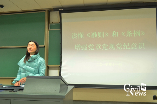 车小洁老师还讲到,党员们需正确理解几条关注的规定,对于年轻的党员们,在网络平台上的发言要慎重,不妄议。到会的各班党支书需要将《准则》和《条例》认真的通读,理解,并将其精神传达给班里的党员,并带领他们共同学习。同时本月也将在学生党员中组织深入开展“讲党性守党规严党纪”学习工作,各学生党支部要将《准则》、《条例》的学习作为12月份政治生活中的大事。到此本次会议圆满结束,大家对《准则》和《条例》的理解也深刻了许多。