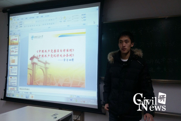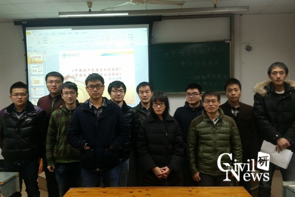 2015年12月15日晚7时,2014级学硕桥梁2班党支部于逸夫馆4321教室召开支部组织生活会,党支部书记王成志带领与会党员重点学习了《中国共产党廉洁自律准则》和《中国共产党纪律处分条例》,并与在座党员展开了热烈地讨论。