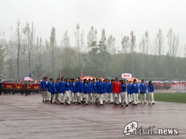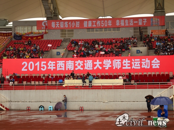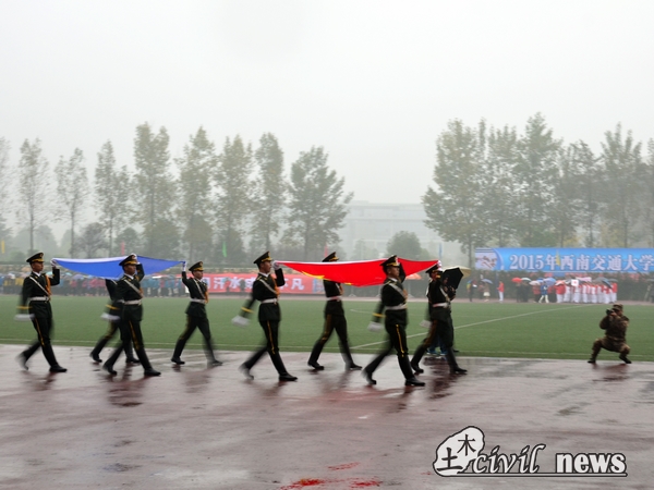 天空中虽然下起了小雨,温度也较前几天低,但是仍然无法阻挡师生参加运动会的热情。待领导进场后,国旗班的同学举着国旗踏着整齐的步伐走过主席台,展示了交大学子蓬勃向上的激情与活力。
