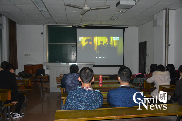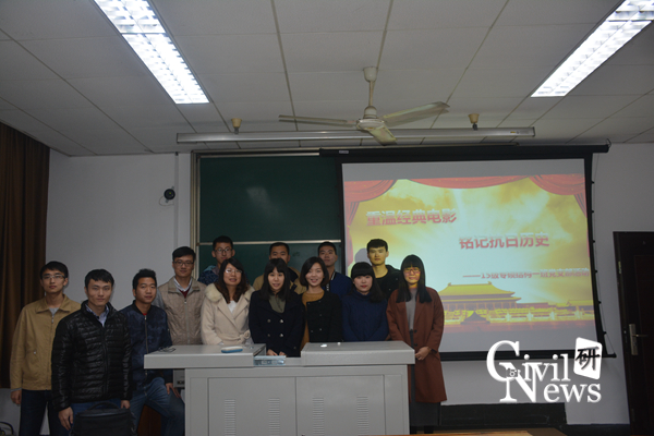 活动刚开始,由2015级专硕结构1班党支部书记廖惠宣读此次活动目的和流程,她表示“今年是抗日战争胜利暨世界反法西斯胜利70周年,为了深切缅怀抗日英雄的丰功伟绩,弘扬爱国主义和民族精神,党支部将进行重温历史,勿忘历史的观影教育活动。以此来激发同学们的爱国热情,增加民族自尊心自信心,珍惜现在的幸福生活。”