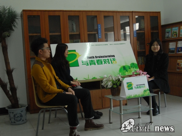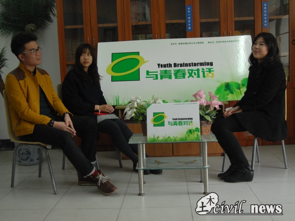 的首档青年思想秀——“与青春对话”访谈节目在天佑斋6号楼的党建室开始了。此节目由土木学院的大学生学业与发展指导中心承办,旨在让优秀的交大学子分享自己独特的大学生活经验与感触。而此次访谈的受邀嘉宾是2012级的杨瑱冉同学和2013级的许晓冬同学,他们因近期在学业上的突飞猛进而备受关注,在下面三十分钟的访谈时间里,主持人孙君将会让两位嘉宾谈谈各自的学习感悟。