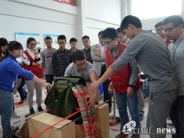 气氛紧张激烈地经过近3个小时后,现场迎来了第一个完工的模型。一组加载,十组围观。前来围观的同学边看边和队友对自己的模型进行讨论,而评委们则认真观察着模型的变形,确认加载的结果。随着第一组的加载完成之后,其他队伍也纷纷完成了制作,顿时间加载区的气氛变得紧张起来。随着模型加载的持续进行,模型呈现效果达到预期的高声欢呼,现场回荡着他们的呐喊声;而呈现效果没有达到预期的小组也并没有气馁,向评委们询问着失败的原因。加载全部完成之后,参赛选手们还要完成模型的称重与拆除以及自己制作区的卫生清扫。
