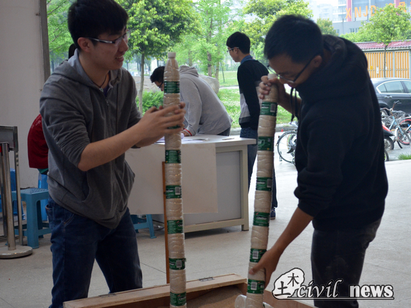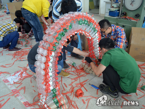 本次隧道工程组的赛题别出心裁,规定用150个矿泉水瓶制作成拱形明洞的主体,结合沙子与水,将模型进行固定。由于塑料瓶材料的弱不禁风,这比赛对选手们的手工水平与模型构造的要求达到了顶点。