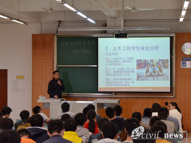 在一片热烈的掌声中,蒋老师开始了讲解。他主要从“土木行业的前景分析”和“学生择业分析”两个方面对学生存在的包括目前的就业前景及行业的就业面等困惑进行解答。他认为土木行业在我国属于朝阳产业,有着良好的发展前景。在今后的发展中,住房需求将稳中有升而目前城市地下空间开发热潮兴起,高速发展的国情下行业存在很大的发展空间。另一方面,蒋老师又将施工、设计、监理及创业等几个职业发展方向的优势与不足详细列出,并以真实的例子进行讲述,进一步加深了在场学生的感受。最后,蒋老师也希望同学们放平心态,注重个人能力与经验的积累,积极面对走向职场后的挑战,完成自我的梦想。