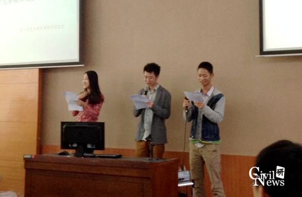 下午,围绕研究生会制度的完善建设和执行力度的提升,三个学校的同学间进行了一场辩论赛。活动的最后,每个学校的代表对此次活动进行了总结,至此本次活动在热烈的掌声中圆满落下帷幕。