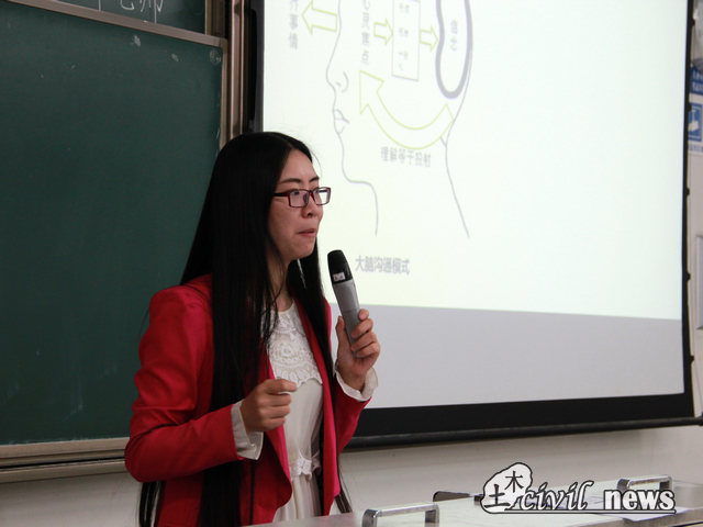 黄老师开始谈及“要点”。PPT上罗列着:“单方面说的一定不是沟通”、“说清楚不等于说明白”、“看到的不一定是真相”、“沟通意义取决于对方的回应”、“沟通目的:你好我好大家好”。黄老师简单的解释这些要点后,进入课程的“技巧”版块——首先是亲和感,它在有效沟通中占60%以上的比重,它是沟通的基础和关键。如何让自己具有亲和感?黄老师说到,交流时,保持微笑,记住名字,倾听等行为都可以提高自己的亲和感,其技巧可以总结为:情绪同步、语调和语速同步、生理状态同步、语言文字同步。然后是善于读懂他人的心,此处黄老师为大家介绍了三种类型的人——视觉型、听觉型、感觉型,并就此框架在PPT上展示三种人的优缺点,与他们配合的技巧和方法。黄老师还补充了如何通过交流特征判定对方视觉类型的方法。课程到此已经接近尾声,黄老师带领大家做一个交流游戏,帮助大家熟悉刚才介绍的方法。游戏是这样的:在黑板上罗列着许多问题,大家在基本熟悉以后开始与旁边的同学互相提问,要求用上自己的双手,在放松时看着对方的眼球,从而判定对方的类型,用合适的方式交流。一番游戏时间后,黄老师与大家分析了一位职员与上司的故事,告诉大家真诚最重要的道理。
