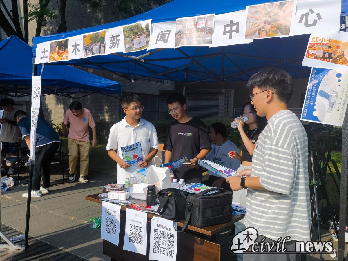 的“主战场”,无数优秀土木学子从这栋教学楼走向更广阔的天地。其浑厚的外形彰显着悠久的历史及丰厚的文化底蕴。而今天,本该幽静的四教中庭显得格外热闹,十大团学组织此刻正在进行一年一度的招新仪式。手持宣传单,各位热情的组织工作人员便走到新生前,积极介绍着组织相关工作内容,表达了对学弟学妹们真诚热烈的欢迎。而各大组织吸引新生兴趣的方式也是精彩纷呈,有租玩偶、摆摊套圈、抽奖等活动,饮料零食也是应有尽有,都用尽了热情去介绍自己,现场氛围活跃而融洽。