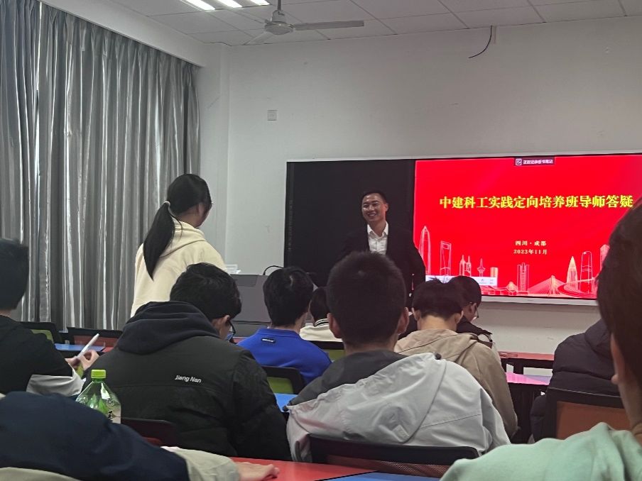 来自中建科工四川分公司的魏梦潇导师以中建科工宣传片为引入点,详细生动的为同学们介绍了企业情况,并为同学们列举了企业承建的成都地标性建筑。此外,魏梦潇导师以个人发展经历为切入点,心贴心地与土木2023-09班的同学们分享了从业10年的感想与成就,同学们收获颇丰;在与导师的交流中,同学们问出了许多在学校里没有办法解除的问题,比如工作后在大学内学的知识如何运用到实际工程中、女生又如何才能在企业中找到属于自己的发展路径。面对这些问题,魏梦潇导师凭借着10年的工作经验都给同学们给予了很多有用的实在的建议,并希望他们能在大学培养好专业知识,在今后的个人发展中能成就一番事业。