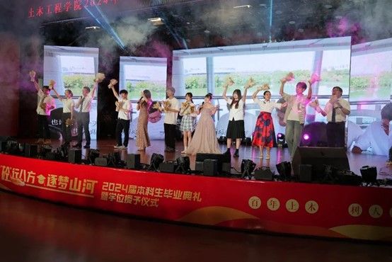 晚会揭幕,由2024届土木毕业生为主的零点乐队燃爆全场。歌曲《给你一瓶魔法药水》蕴藏着对青春、对未来的无限憧憬与希望。歌曲《不再犹豫》表达了毕业生们对未来的坚定信念与无畏决心。