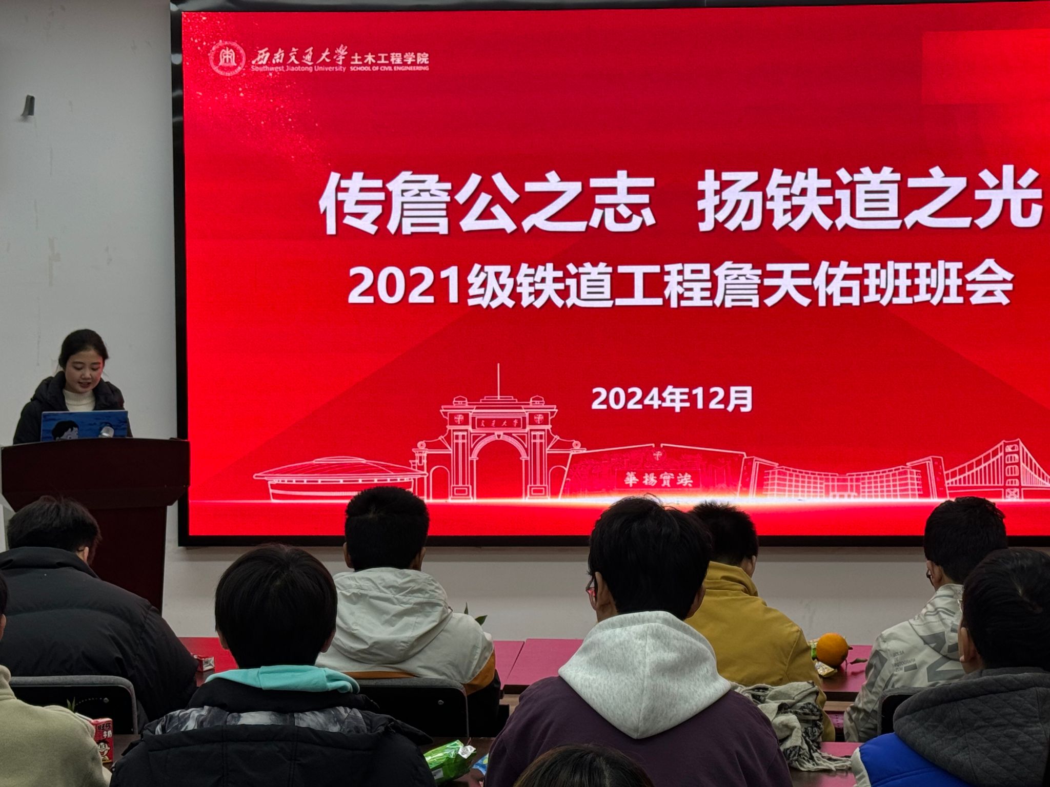 2021级詹天佑班于12月9日在X4407教室举行了以“传詹公之志,扬铁道之光”为主题的班会活动。