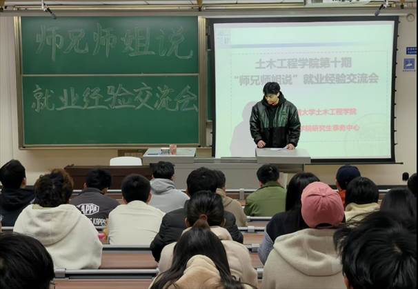2025年3月20日19:30,第十期师兄师姐说就业经验分享会在九里校区4323举行,由岩土工程的余康鑫师兄和桥梁与隧道工程的李斯博师兄为大家分享了求职过程中的经验与感悟。
