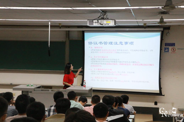 车小洁老师在逸夫楼4409教室给2019届毕业生做了学校关于就业政策的一次宣讲。