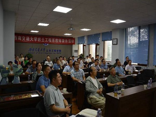随后,张建经教授和张继春教授结合各自的研究经历,分别作了题为“包裹碎石桩复合地基静动性能研究”和“隧道(巷道)周边孔光面爆破的定向断裂、破碎与损伤研究”的学术报告。两位教授的报告集各自多年研究精华,内容丰富,学术价值高,引发全系师生对相关研究的深入思考,也被他们身上的科学精神打动。报告深入浅出、风趣轻松,为岩土系全体师生今后的学习和研究指明了方向。报告结束后,张迎宾教授、杨涛教授、教师代表魏星老师和袁冉老师为两位教授敬献鲜花并赠送纪念品,祝福他们福寿安康,笑颜永驻。张建经教授和张继春教授对系室组织本次活动表示感谢,他们回顾了多年以来与各位老师相处的点滴细节,感谢多年来大家对自己工作的支持、帮助和理解,希望青年教师和年轻学子将交大岩土精神薪火相传,为复兴交大岩土贡献力量。