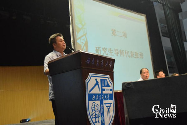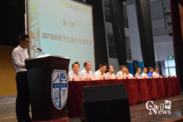 随后,研究生新生代表李孝攀同学发言,他在演讲中提议在座的2015级新生:作为一名交大土木人应该勇于挑战困难,不断进取,不断提高自己,成为一名合格的“五有交大人”。