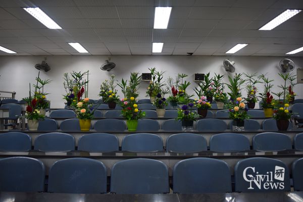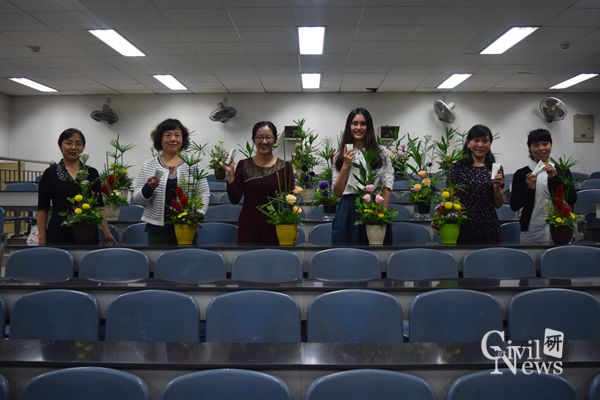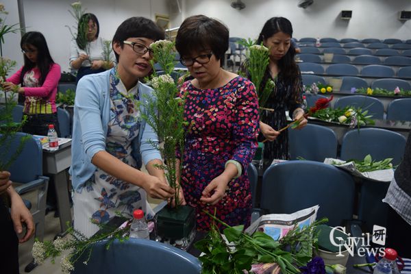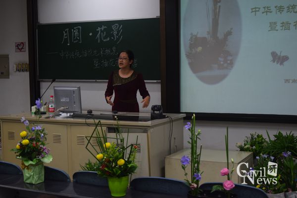 本次活动分四个阶段进行:(1)党委副书记李彤梅宣布活动开始及活动流程;(2)杨丽江老师开展专题讲座;(3)插花艺术协会的四位老师进行现场教学;(4)现场进行插花创作,并评选出佳作。