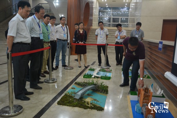 副院长易思蓉、党委副书记李锦红、院长助理刘成清陪同,桥梁系王琦老师讲解下,对参赛的造型组和承重组模型进行了参观考察。