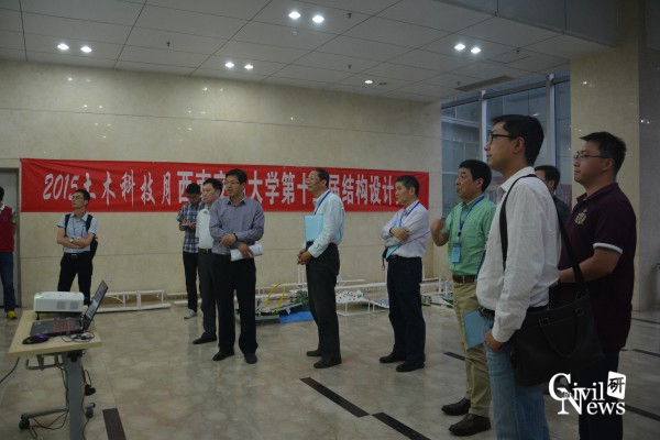 第十五届结构设计竞赛”桥梁组决赛进行时,评估组专家在色情av影片