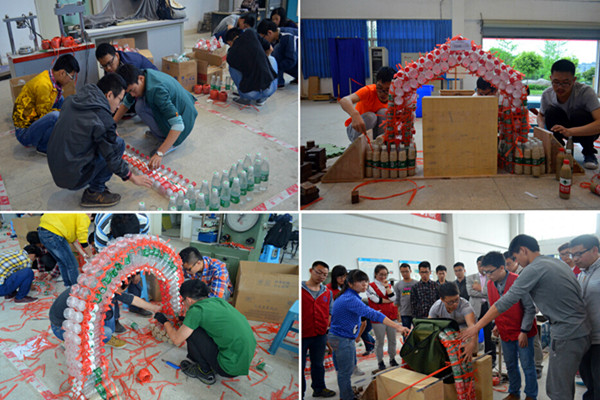 4月19日隧道工程结构设计竞赛在土木工程实验教学中心举行决赛。参赛队伍共48组,本次隧道工程组的赛题别出心裁,规定用150个矿泉水瓶制作成拱形明洞的主体,结合沙子与水,将模型进行固定。由于塑料瓶材料的弱不禁风,这比赛对选手们的手工水平与模型构造的要求达到了顶点。