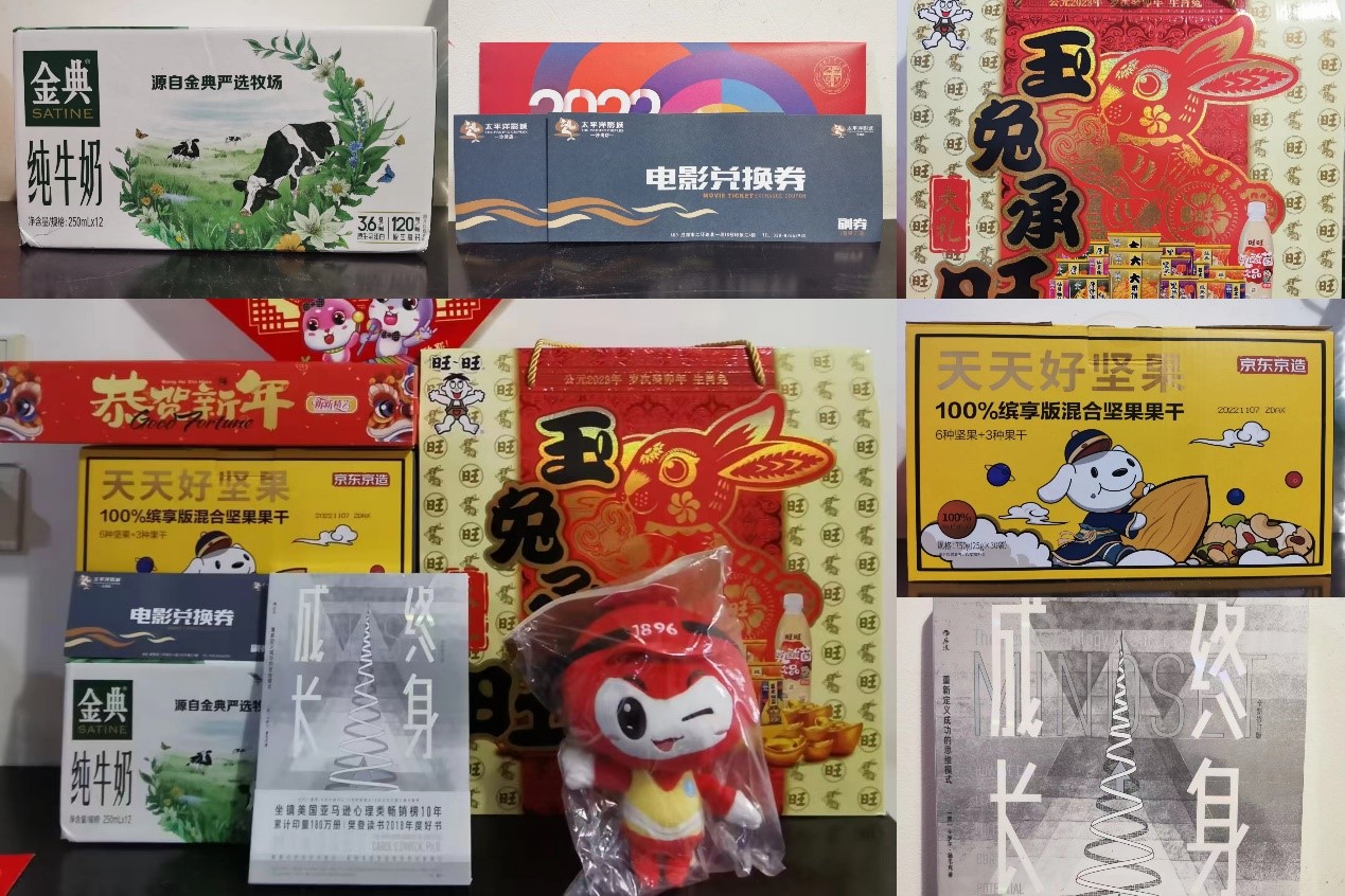 今年,学院为每一位留校学生精心准备了“红小土陪你过大年”新春慰问大礼包:一盒坚果礼盒,一箱金典有机牛奶,一袋兔年限定旺旺大礼包,一本书《终身学习》,两张春节档电影票。此外,还准备了营造节日氛围的“福”字、春联、红小土玩偶等小礼品。
